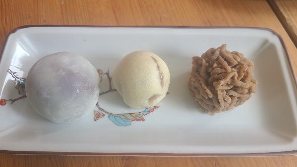 ③栗の和菓子3種(栗蒸し饅頭、栗大福、栗のねりきりの3種作ってお持ち帰りできます。試食もできます。抹茶付き)
