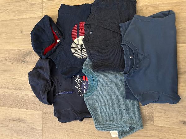 サイズは130cm前後、普通体型の息子(6月生まれ)が7〜9歳ごろまで着ていたものです。汚れや破れ、毛玉ももなくきれいな状態です。8点まとめて20ユーロバラ売りご希望の方いらっしゃいましたら2点以上ですと対応致します。パリ市内中心付近でのお渡しになります。