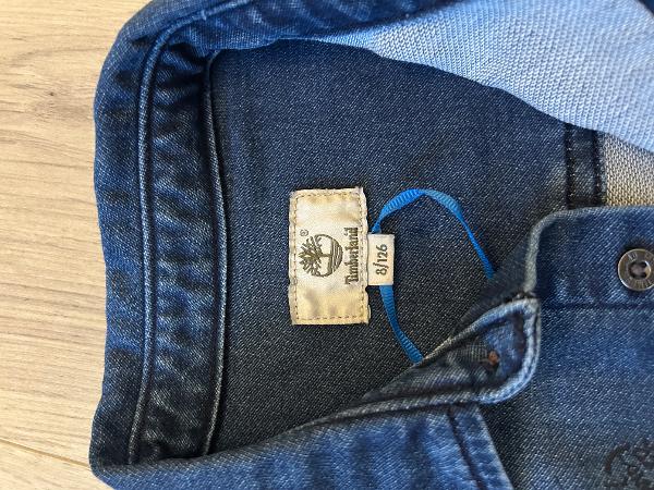 Timberland の8歳サイズの柔らかいジャージ生地のジーンズシャツ(カーディガン)と撥水パーカー(首の部分に収納可能な隠れフード付き)です。