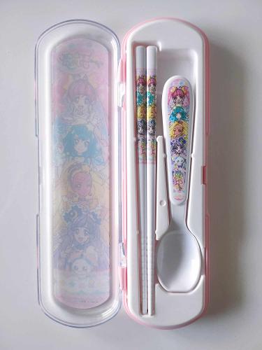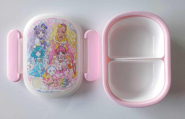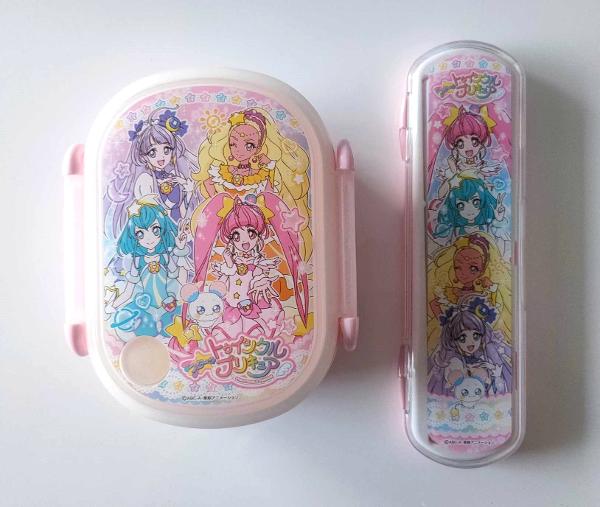 17.プリキュアのお弁当箱(350ml)+カトラリーセット 5-6回使用のみ・美品 セットで8€ +【おまけ】プリキュアのお話つきぬりえ絵本