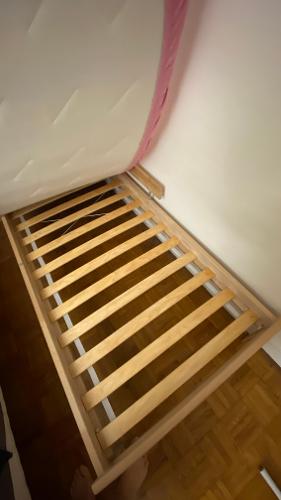 ikeaのベッド、マットラス、シーツ類(画像にあるもの)のセットです。女の子用です。マットラスのカバーは洗えます。使用後2度ほど洗いましたが、シミが残っています。30ユーロ希望。1月中にパリ12区の自宅まで取りに来てくださる方。https://www.ikea.com/fr/fr/p/sniglar-cadre-de-lit-avec-sommier-a-lattes-hetre-s19185433/