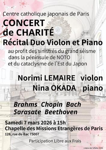 能登半島地震および東日本大震災被災者支援のチャリティーコンサート。パリ日本人カトリックセンター主催。ご寄付はカリタス・ジャパンを通して被災者支援に送られます。