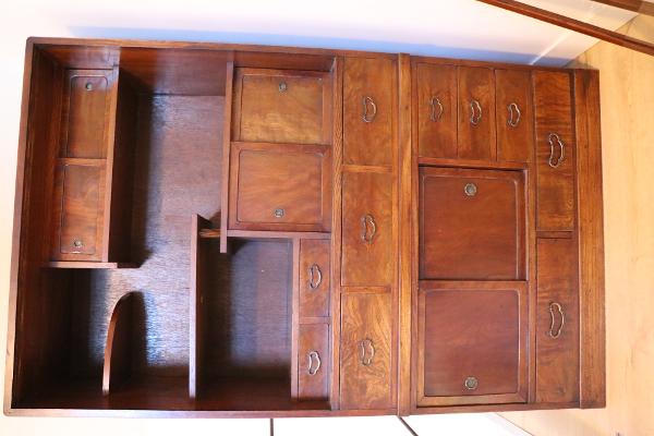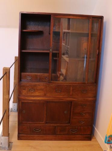 30年前に都内のアンティークショップで購入し、フランスまで運んできた古い茶箪笥です。茶箪笥の時代は分かりません。ガラス戸のある部分と下とで2つに切り離せます。一番下の引き出しの中に、購入時からある、子どもが描いただろうと思われる女の子の絵の可愛い落書きがあります。