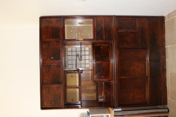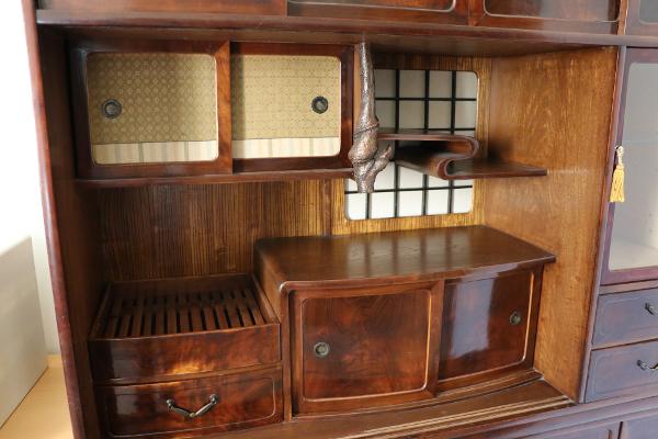 30年前に都内のアンティークショップで購入し、フランスまで運んできた古い茶箪笥です。茶箪笥の時代は分かりません。ガラス戸のある部分と下とで2つに切り離せます。