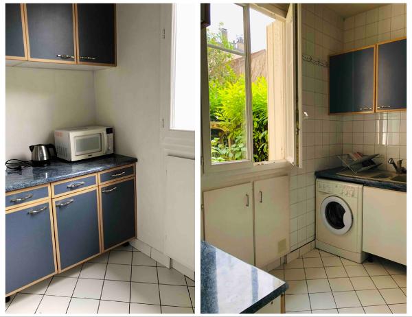 寝室、ダイニングリビングルーム、キッチンに分かれた間取りで、ダイニングリビングルームやキッチンからは中庭を眺めることができ、暮らすように滞在できる居心地のよいアパルトマンです。女性お一人でも安心してリラックスできる、広々とした40㎡のお部屋。外から中を見通せない少し高さのある1階で、大きなスーツケースの持ち運びも簡単です。カップル或いは、1名利用のみ。