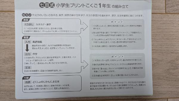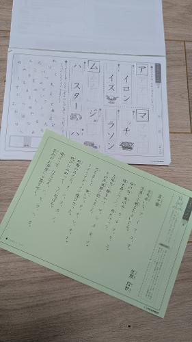 ひらがなは幼稚園時のプリントCで学習していますので、小学生プリント『こくご』はカタカナと漢字の学習、また簡単な作文が主な内容です。ひらがなを身につけた子供さん向け。受験対策としても役に立ちました。コピーして使っていたのでファイルからは外れていますが、未記入で非常に良い状態です。10ヶ月分セットで95€日本から持ってくる際にスーツケースの中で箱の左側が損傷してしまいましたが、収納には問題ありません。郵送は応相談。パリ郊外となりますが、RER-A線の最寄り駅で受け渡し可能。