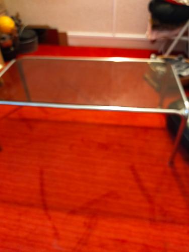 茶の曇りガラスのテーブル 足は7銀のスチールですガラスは取はずし可能10E バンセンヌまで取りに来て下さる方
